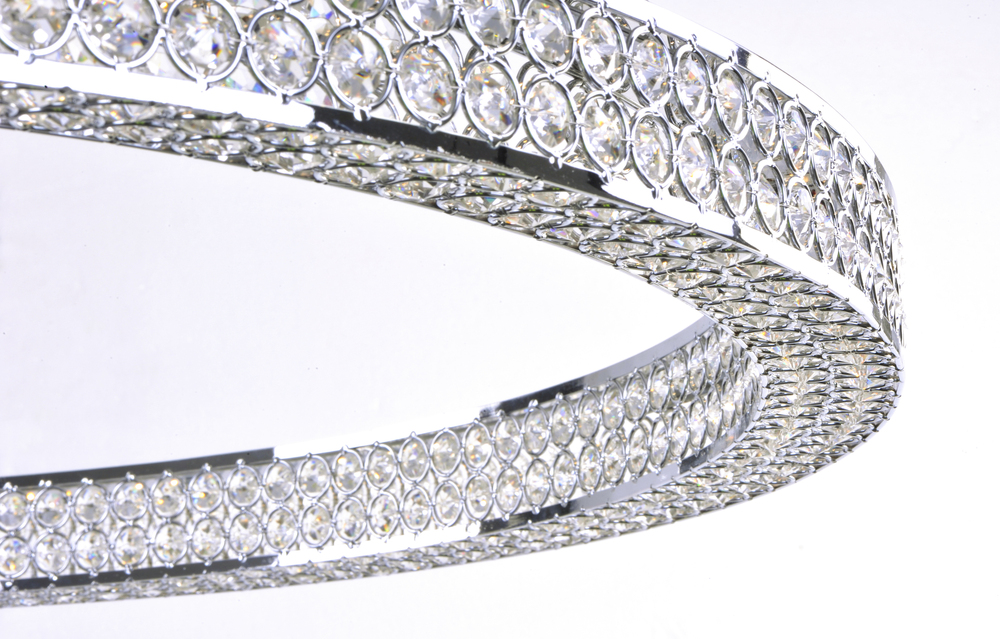 Frames of metal rings encased with Beveled Crystal Jewels, are finished in Polished Chrome. Suspended by cables as if floating In air, these rings cast rainbows of light when illuminated by the Integrated LED.