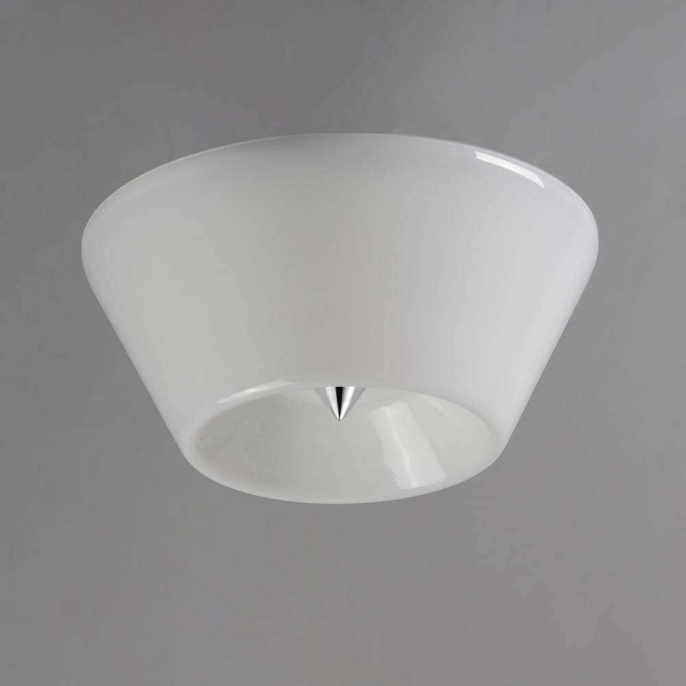Accentuating the cone shape, this LED surface mounted fixture features a tapered glass shade and is supported by a conical finial in complementary finishes. Available in Polished Chrome, Matte Black, or Natural Aged Brass this simple design adds flair to a